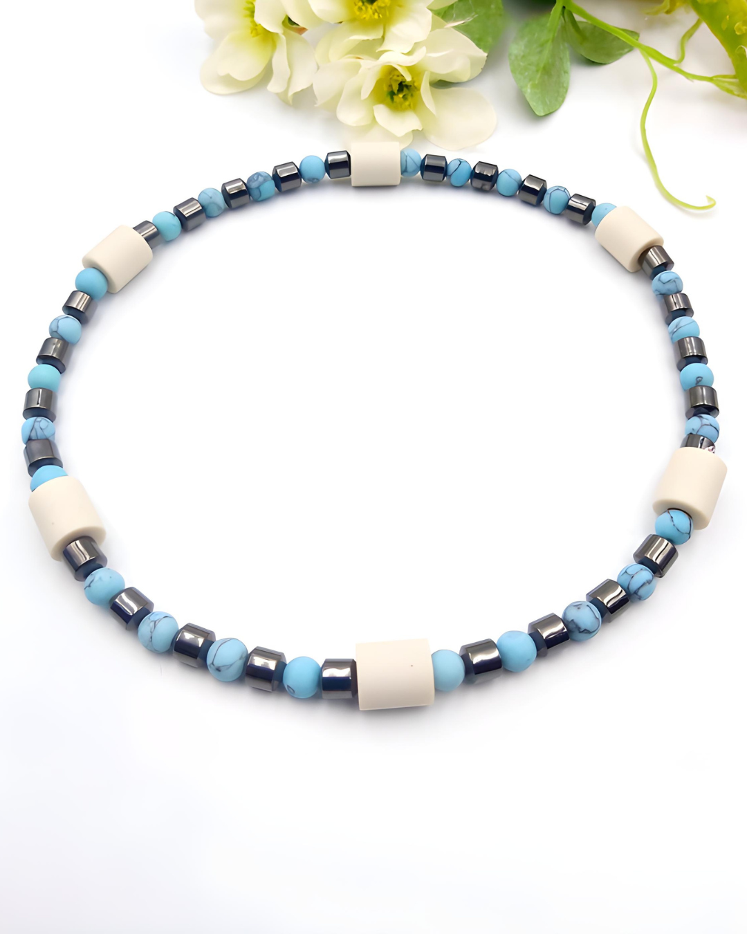 Die Kombination aus Türkis und Hämatit sieht nicht nur schön aus – ihr wird auch eine unterstützende Wirkung gegen Zecken und äußere Einflüsse nachgesagt.
