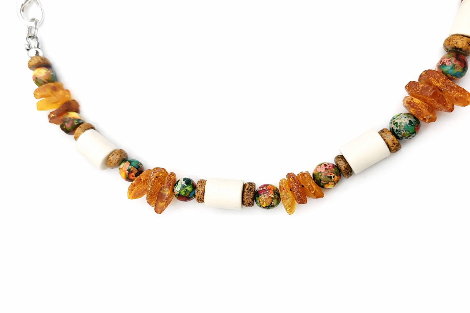 Die Kombination aus Bernstein, Ozeanjaspis und EM-Keramik macht das Halsband zu einem besonderen Accessoire, das bewusst ohne chemische Zusätze auskommt.